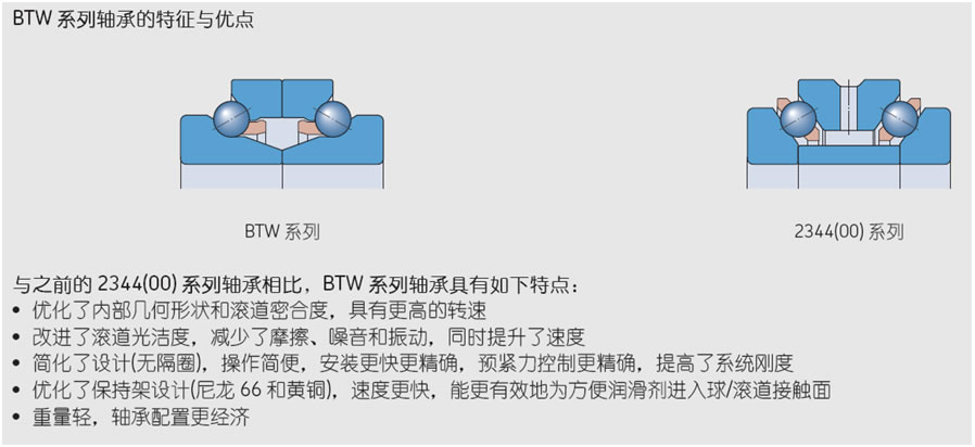 為了滿足對(duì)高精密應(yīng)用的軸承性能越來越高的要求,SKF開發(fā)了新一代的雙向推力角接觸球軸承。 這種 BTW 系列超精密軸承具有全新的優(yōu)化設(shè)計(jì), 與之前的 2344(00) 系列軸承相比,能適應(yīng)更高的轉(zhuǎn)速。 這種全新設(shè)計(jì)全面提升了軸承的性能,其優(yōu)點(diǎn)相當(dāng)明顯。